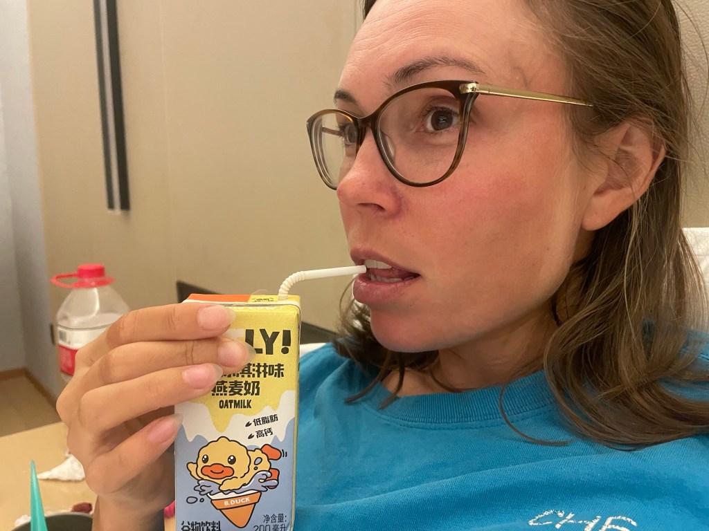 Our initial plans to leave were put on hold at breakfast time. We weren’t in a hurry. Despite only cycling two full days since our last break, they were big days. A rest would be beneficial. The breakfast hall contained the usual fare. A noodle bar. Selection of salad and vegetables, including tofu skin. Soya milk. Excitedly, also a bean to cup coffee machine.