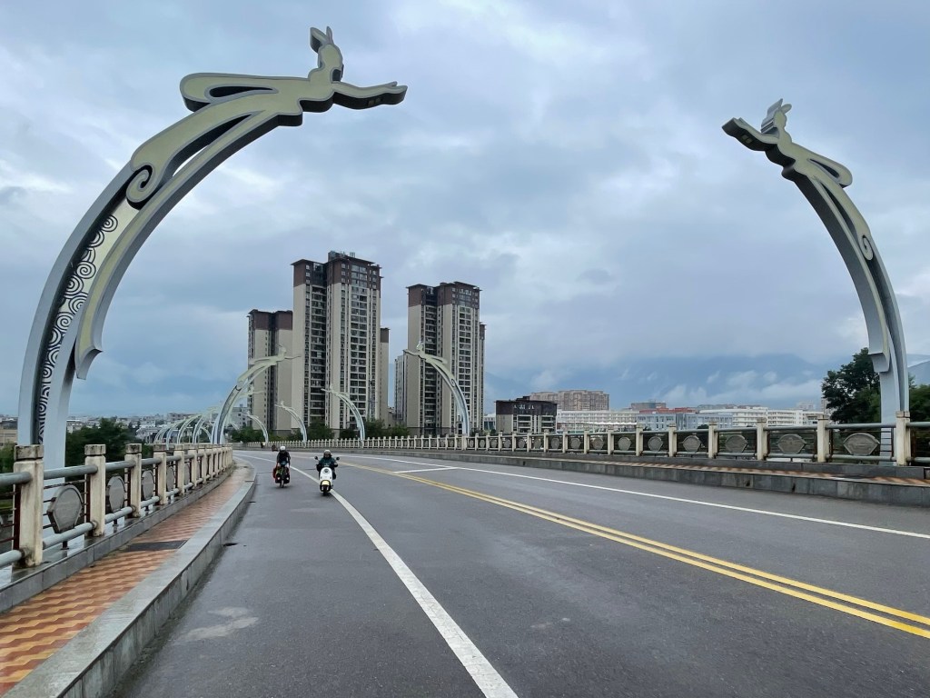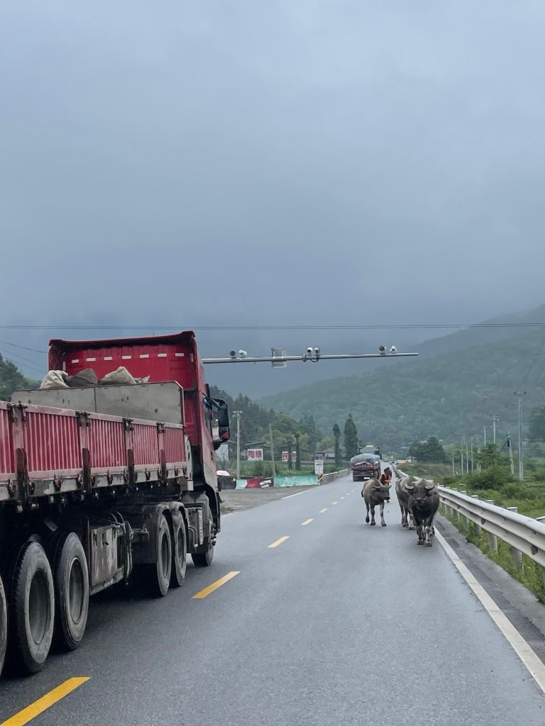 A grand landscape opened up at the base of the huge peaks around us. The enormous G5 expressway crossed the town of Caogu, 30m in the air. The G108 was the original road. Bypassing the town would have stripped the people of passing income, were it not for the steady stream of trucks.