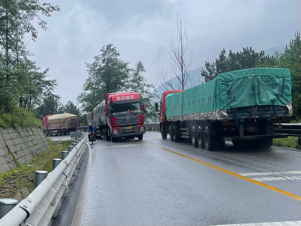The next climbed tested us. Another 200m of ascent that had several steep spots. It culminated in a 1200m tunnel that went downhill through the mountain. It was a rather terrifying experience. The rumbling thunder of trucks amplified by the concrete road. It would have nice to have laid our eyes on Huatou just behind us. It rose to 4751m. Rather than the huge peaks dominating the area, it was just cloud.