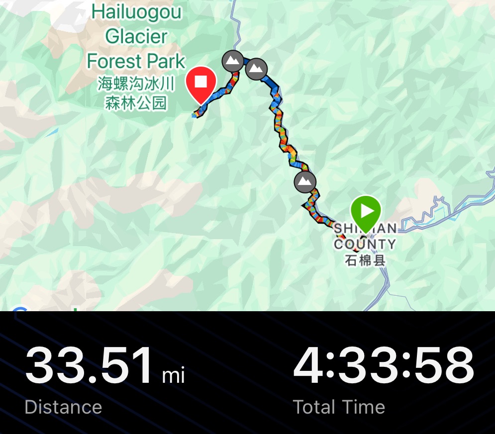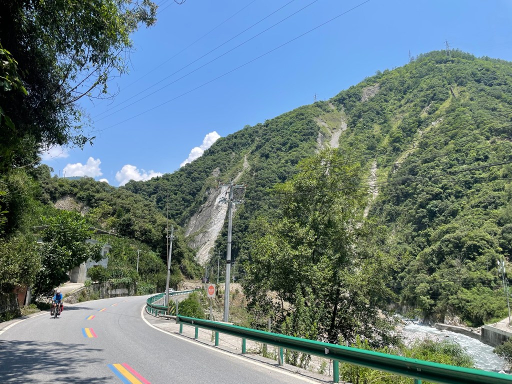 The hill was a mix of the steep and flat. We struggled to keep ourselves motivated. The centre line of the road was a tourist enticing rainbow. Construction of landslide barriers was taking place. It was a relief to arrive in Caoke. The town appeared to be dead. It was clearly a winter resort town. We’d taunted ourselves with the idea of a fancy hot spring hotel. There was a palace of a hotel. Alas it was still under construction.