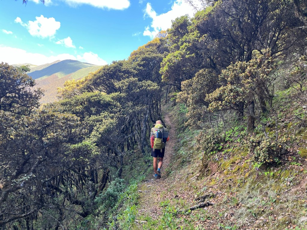Jonathan saluted Mount Gongga just as it went out of sight. It was sad to leave him behind. His majesty was commanding. We hiked back to the junction where we would head a different way. Immediately we were submersed in woodland. A magical fairytale. It was a slither of a path contouring the valley. We crunched along on dead leaves through what must be primeval forest. The occasional spiritual Tibetan flags adorned the trees. Saplings grew everywhere. The forest floor was alive. Birds chattered all around us. We saw white pheasants blustering away from us.