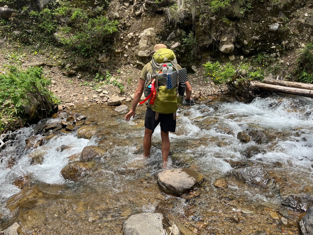 We had more stunning views of jagged peaks up the valleys. We heard the sound of water ahead and knew we had another river crossing. The sound made us anxious. It looked big when we got there and was flowing fast.