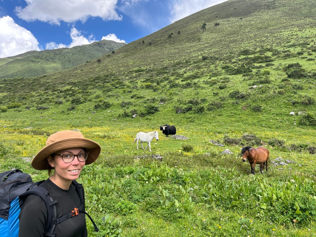 The path was getting less and less clear. At one point we ended up at someone’s house. Up ahead we saw a herd of yaks. One of them was less than mellow and started to race towards us. We panicked and shouted. We stuck together to appear big. It put him off. Obviously unhappy at being separated from his pals, a straggling yak ran straight down the path towards us. We ducked behind a bush. He ignored us.