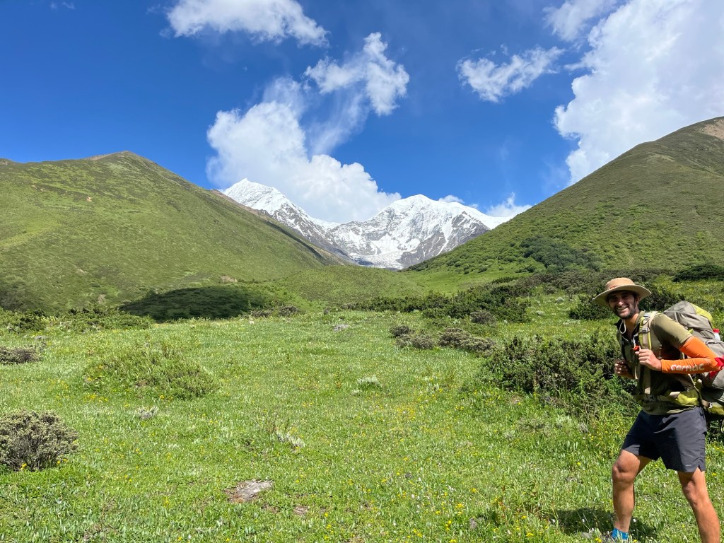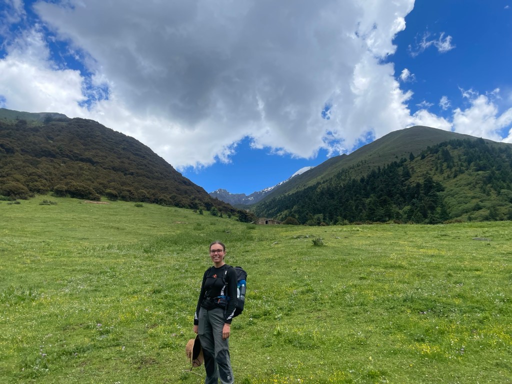 We trudged up and down searching for a good crossing point. We went all the way down to the bottom in the end. It was pointless. We just had to cross with the path. It was the widest point after all. The first part was easy. There were plenty of rocks to balance on. The second section was deep and gushing. A force that nearly toppled us over with our heavy backpacks. The third part was nothing after that. It was like walking through a puddle. Immediately afterwards the sound of the river disappeared. We were back in another meadow. It was surreal. Our hearts were racing.