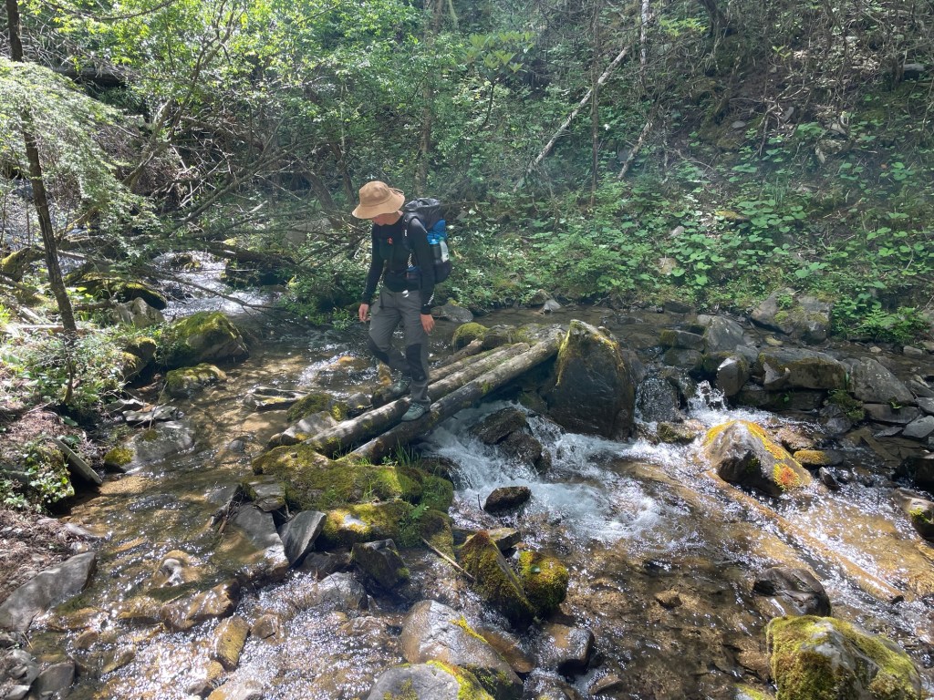 The path was still a tiny piece of flat ground on a steep valley side. It was blocked by the odd fallen branch. It didn’t feel like people had walked the path recently. The next river crossing had a substantial flow of water. Three slippery logs formed the bridge. Afterwards we came upon an incredibly beautiful meadow. A sublime place that could be mistaken for heaven. Perfect grass, intermingled with flowers. It was only brought down to earth by the people who tossed their rubbish willy nilly.