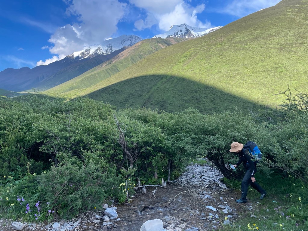We enquired which way the four young Chinese had come and were going. They’d traveled our route for tomorrow without getting wet at all. A relief. They weren’t going our way, unsurprisingly. They’d head down this bank and leave the valley. All day we’d hoped to camp alone. Now we couldn’t be more grateful for the three other tents around us.