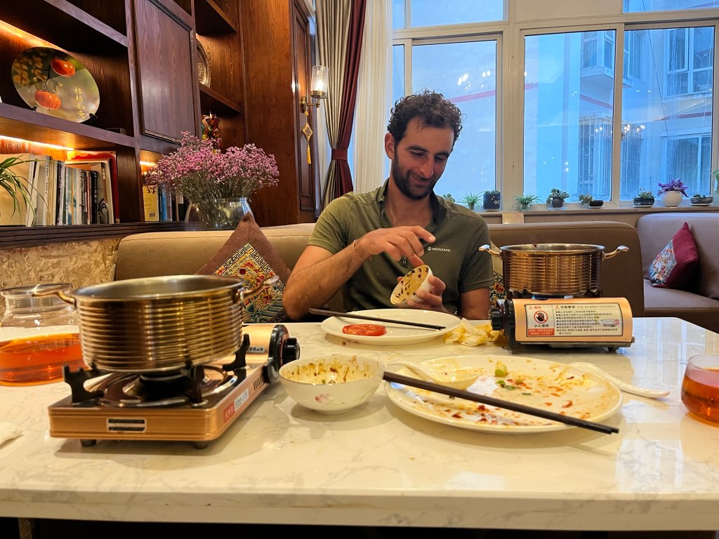 Having only one set of clothes, we washed what we could. We’d have to make do with dirty trousers. Our feet were agonisingly painful after our rocky descent. We were now at a mere 2500m in a huge city. Delaixi Vegetarian Restaurant was the only suitable eating establishment we could find. A mere 8 minute walk.