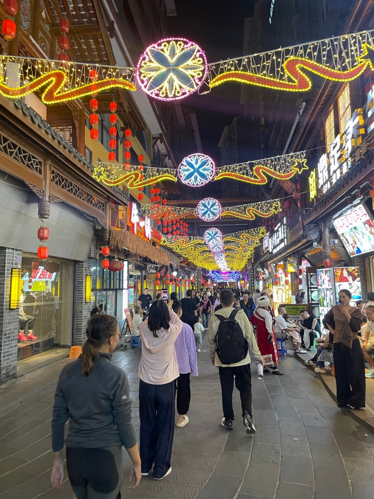 The restaurant was self service hotpot. We had individual saucepans. Frankie had mushroom, Jonathan had spicy. There was an area of foods including faux meats. It was thrilling to have real, hot food again. We were in there for a while munching away. Afterwards we walked down the Food Street. Not to eat, just to observe. It was a bustling city with thousands of tourists. Colourful lights. Singing and dancing. Of course we were the only westerners. We enthusiastically took photos with people.