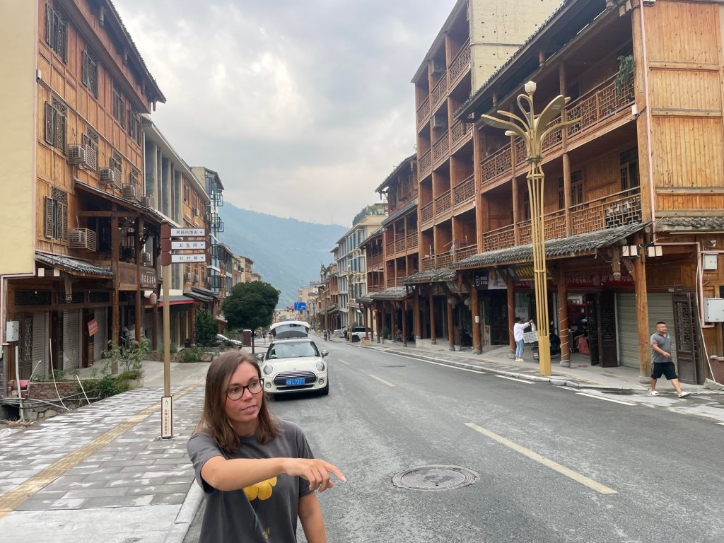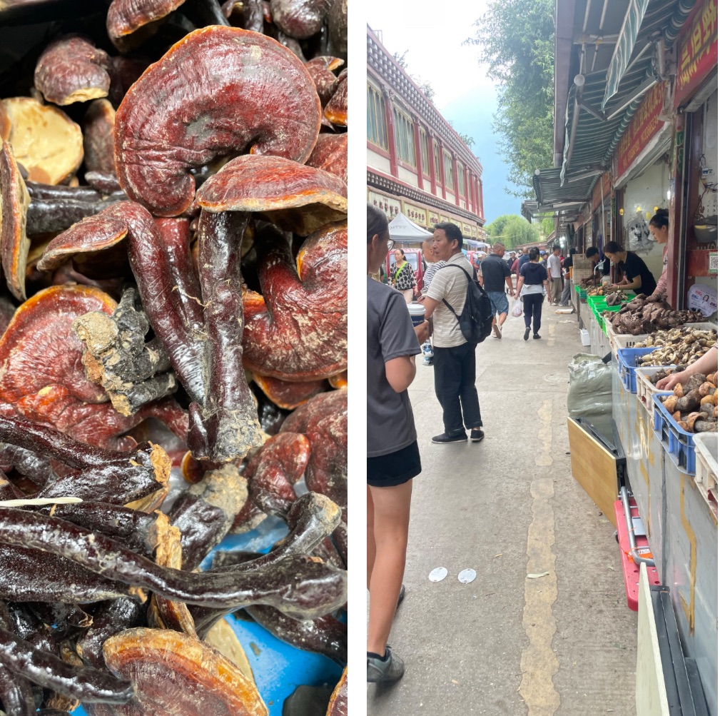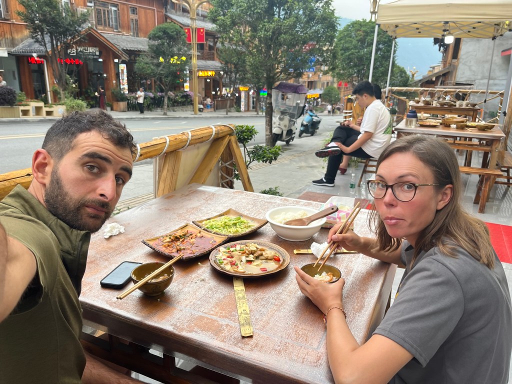 Moxi was another tourist town. It had been completely flattened in the 2022 Luding Earthquake. The buildings were all concrete structures, with pretty oriental facades, presumably now built to be earthquake proof. Old Town Moxi was simply roads of identical shop fronts all housing restaurants. Vegetarian dishes featured prominently on one menu, so naturally we ate there. An indulgent mushroom dish enticed us. We’d seen so many of them, but they were still expensive.