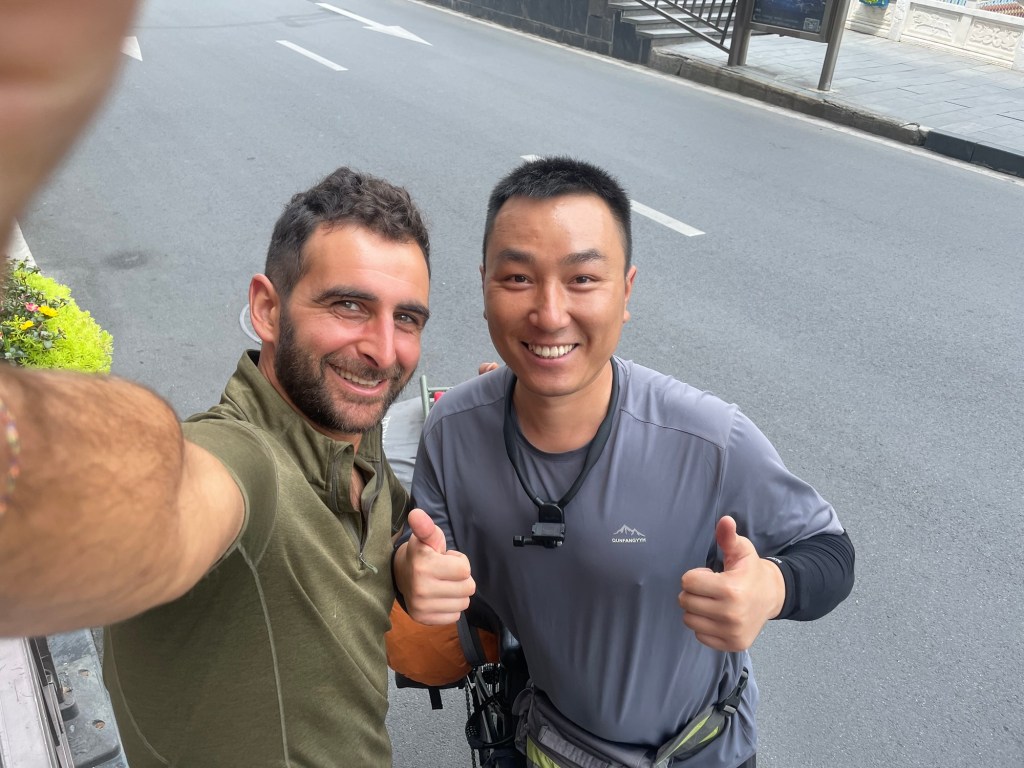 The road went a long way downhill. Over 1000m. The G318 is a very famous Chinese road. As such it was manically busy. Not just the usual trucks, but travellers on motorbikes and surprisingly, a very large number of bicycles. We were fairly pleased not to be cycling it. It didn’t look particularly enjoyable. Jonathan cheered as many of them as he could.