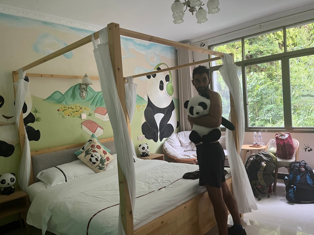 Post dinner we took a taxi to our panda themed hotel, a long way up into the mountains. For some unbeknown reason our driver had a very old car, that had almost zero power. Motoring up the hills was done at a snails pace. Not that we’d be any quicker on our bicycles.