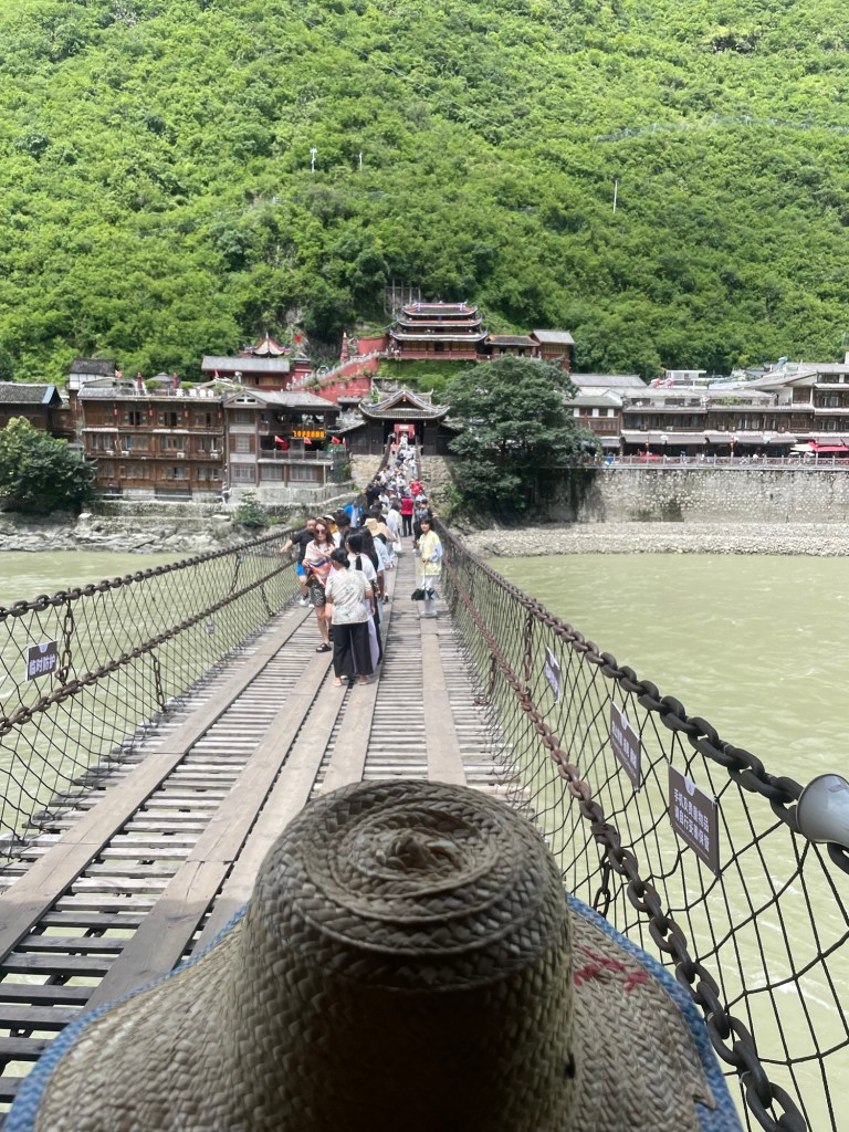 Now it was a tourist attraction crossed with a theme park ride. Deliberately swinging the bridge was fun for young men. Stumbling along the planks was a fun activity for tourists. Thousands of people go across every day. The number of phones that must get dropped through the slats into the Dadu must be high.