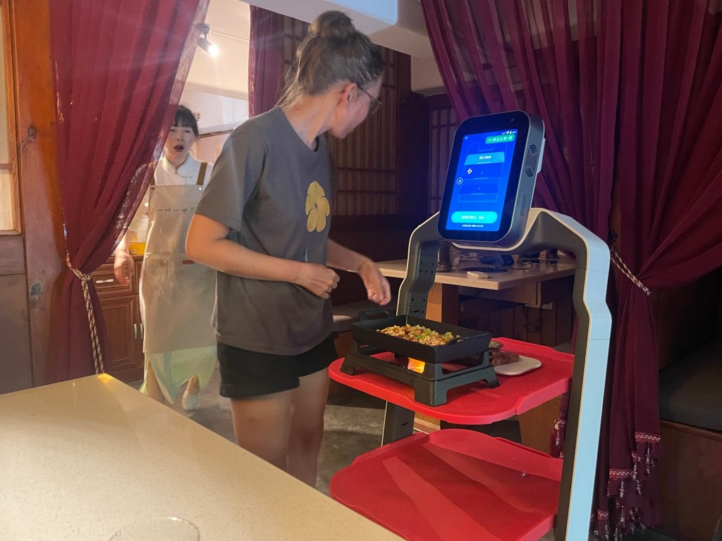 After an unsuccessful hunt for an agricultural products market, it had long closed for the day, we took the bus to a restaurant called Yiyeyi. Though we hadn’t come across one yet, it was a vegan chain in China. Tucked away in a quiet corner of the city, the decor was tastefully oriental. And we were the only customers. Dinner consisted of an assortment of faux meat treats. Delivered by robot of course.