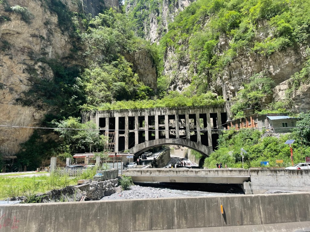 Overhanging cliffs, gushing waterfalls. Still not quite enough for us to do less than crave the sanctity of a hotel. Guanliaohe tunnel was 2km of perfectly tiled clean, smooth hill avoidance. Cleaner than most London Underground stations. On the other side we gasped at the sudden openness of our surroundings. A huge dam behind us.