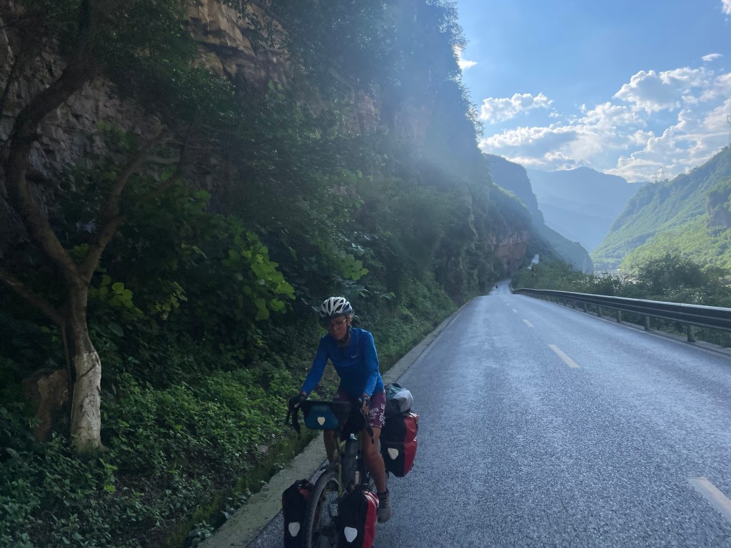 Climbing the hill into the town proved disheartening, Frankie jumped off to push up the steep hill. Mining operations crossed the gorge that had started to reveal itself. Dramatic, tall cliffs rose up above us, and the river. Mapy found it impossible to tell us the elevation change. The sudden cliff drops confused the software. The road climbed steeply along the cliffside. The hot Sun was making hard work harder. Lorries trundled past, filling the air with infuriating amounts of dust.