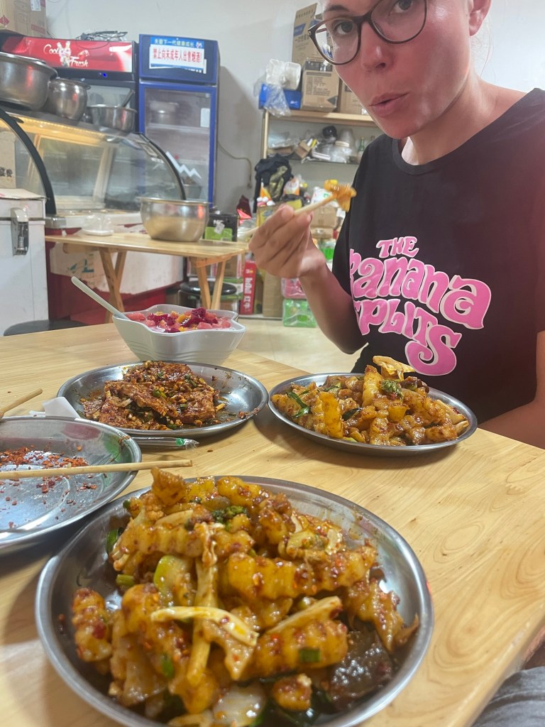 Strolling around the town eventually yielded an inviting restaurant. The tastiest potato chips in China as Frankie eagerly complimented them. It wasn’t hard. They just had to cook them. Served with roasted wheat gluten and stinky tofu skewers. Jonathan insisted on buying more durian from the large Century supermarket. Back in our hotel we celebrated our longest ride record for the trip. By just 1km. We’d hit 107km along with almost 1000m of climbing. Costly golden custardy durian was deserved!