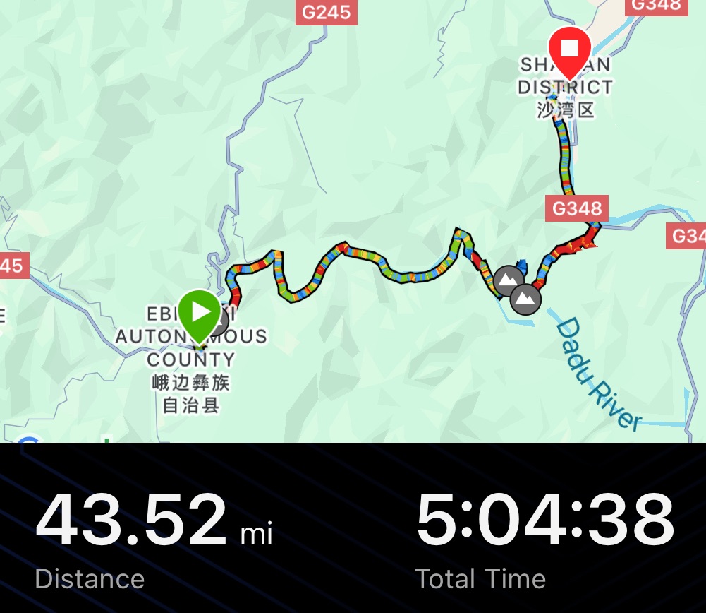 The sounds of cicadas accompanied us. We looked at pretty flowers. If it hadn’t for the burning heat it would have been an idyllic place to cycle. Across the Dadu the Kunming-Chengdu was frequented by loud little shunts. At the next little shop we saw we stopped for water and pepsi. The heat was defeating. At least the cycle path gave us relief. It was implausible that people didn’t realise how much hotter the Earth was getting.
