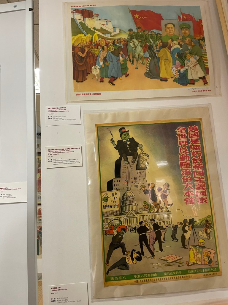Jumping on a bus we headed to a recommended attraction. Hidden in a large multistory office building, there was no signage outside, was the Propaganda Art museum. The only one of its kind in China. ‘Big character’ posters as they’re known, were a mix of political and cartoon. Similar to cartoons in modern newspapers. They’re typical ‘communist era’ artworks. The museum was of course licensed and by no means operated under the radar, but it wasn’t heavily publicised either. There were only tourists inside, including a friendly boy from Newark who had Chinese heritage. Jonathan’s favourite poster was one showing the Tibetan people welcoming the PLA. Sadly, most posters were sent to the paper recycling museum once Deng Xiaoping became paramount leader and introduced market economics to China.