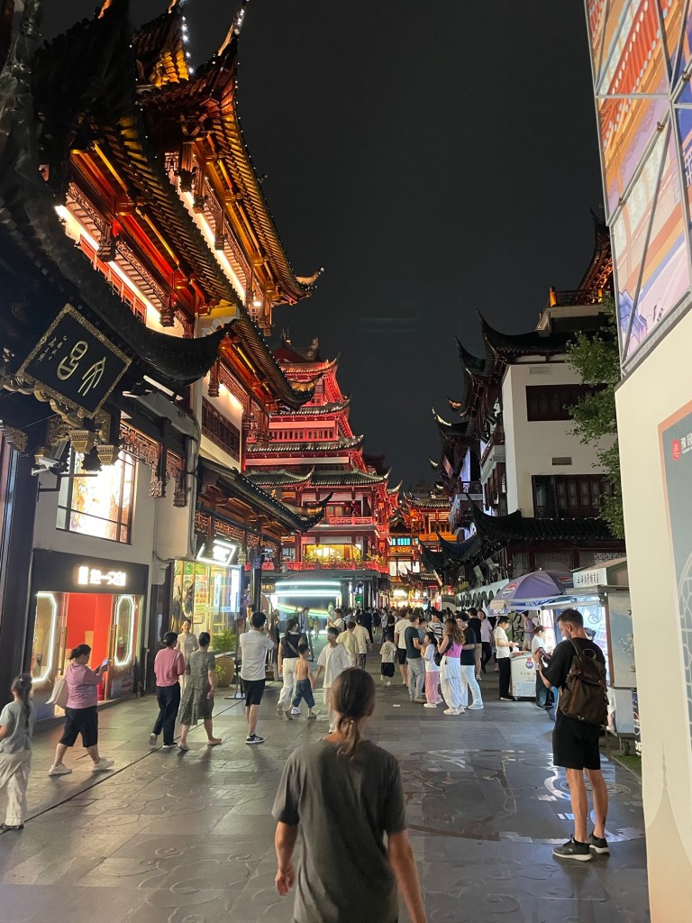 Still on a whistle stop tour of the city, and after dark, we visited the City God Temple. Misled by the opening hours, what we actually found wasn’t cultural at all. Rather than a lit up old religious site, we found the new religion of the world. Horrific consumerism. Rows of fake old buildings housing shops. The worst type of skeuomorphism. Thousands of people were milling around buying touristy rubbish at inflated prices. Needless to say, we ran away.