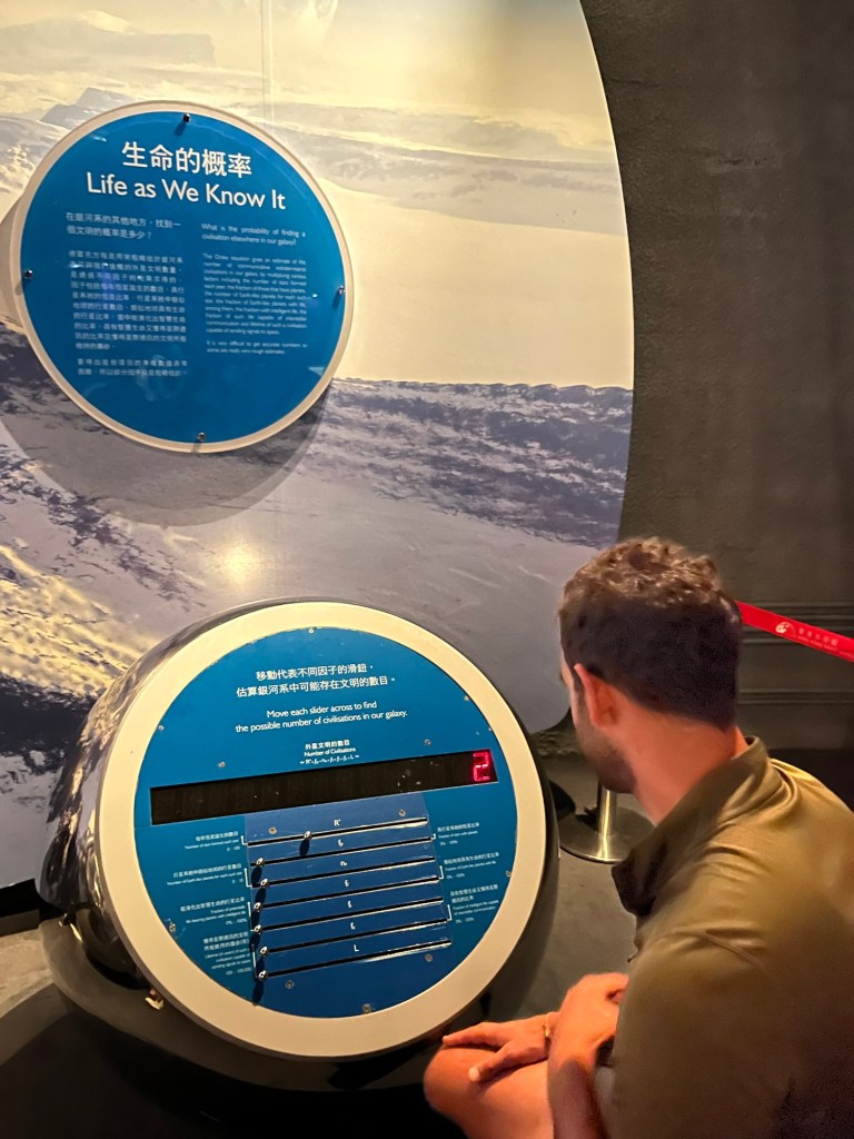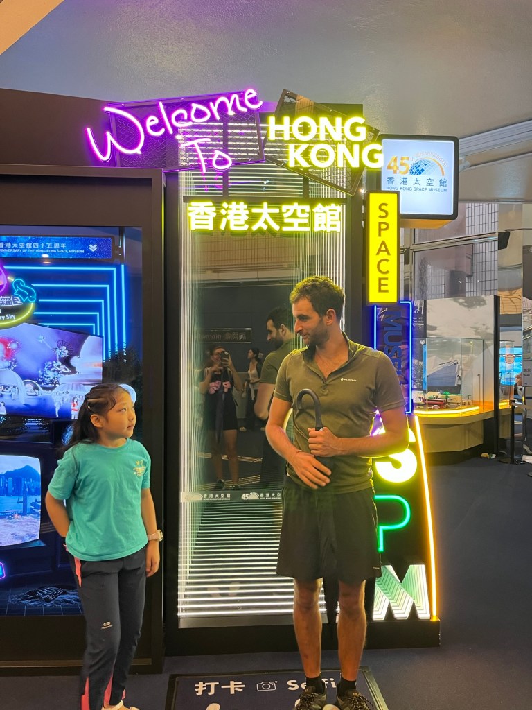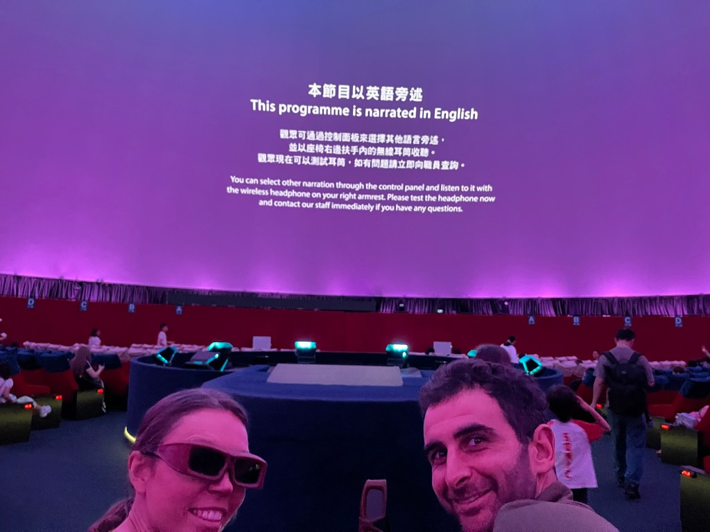 Hong Kong metro was confusing. Rather than only using side by side tunnels for opposite line directions, they were sometimes above each other. Anticipating the awful weather we’d booked the Space Museum the day before. Built in 1979, the iconic dome was near the waterfront. Upon entering we went straight into the base of the hemisphere to visit the cosmos. Far from being family friendly, the excellent exhibition not only detailed the Coriolis effect, aurora borealis, light refraction, Doppler effect and causes of comet visibility but also had fantastic interactive visuals to explain. Much of it was potentially far beyond the understanding of the young kids, who instead ran about mashing all the buttons, while their mothers took pictures of them “doing science”.